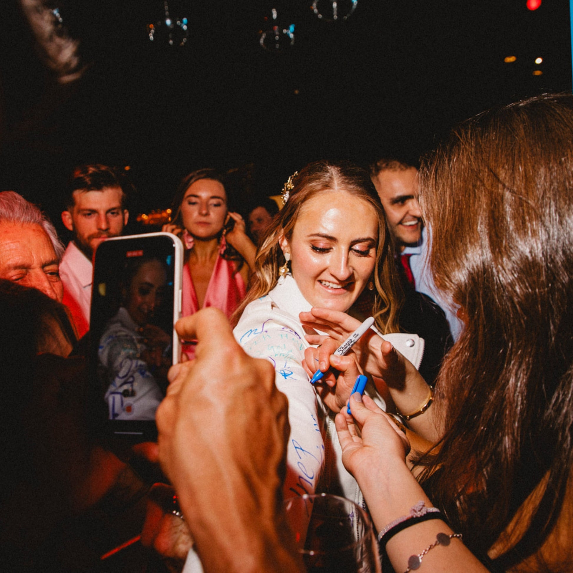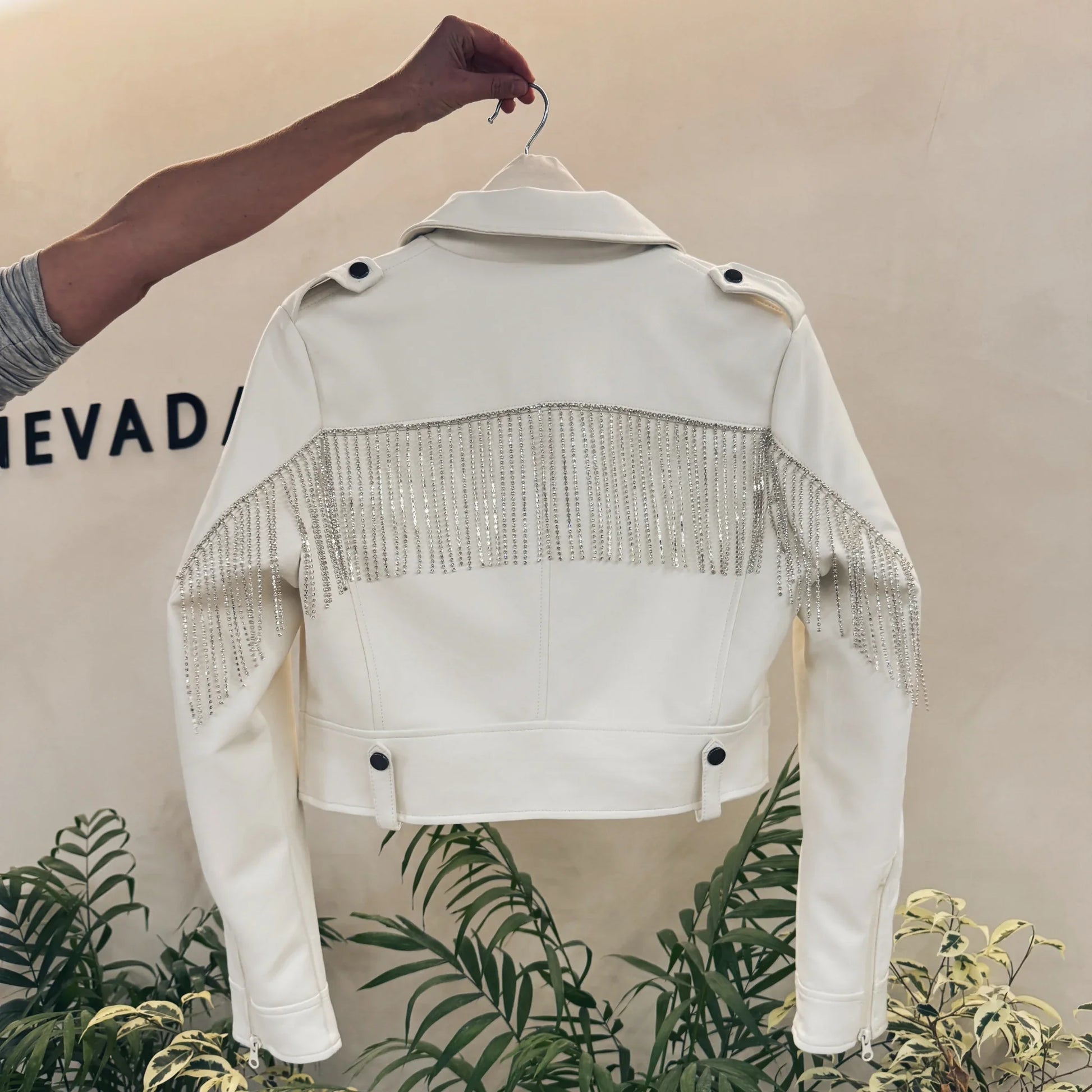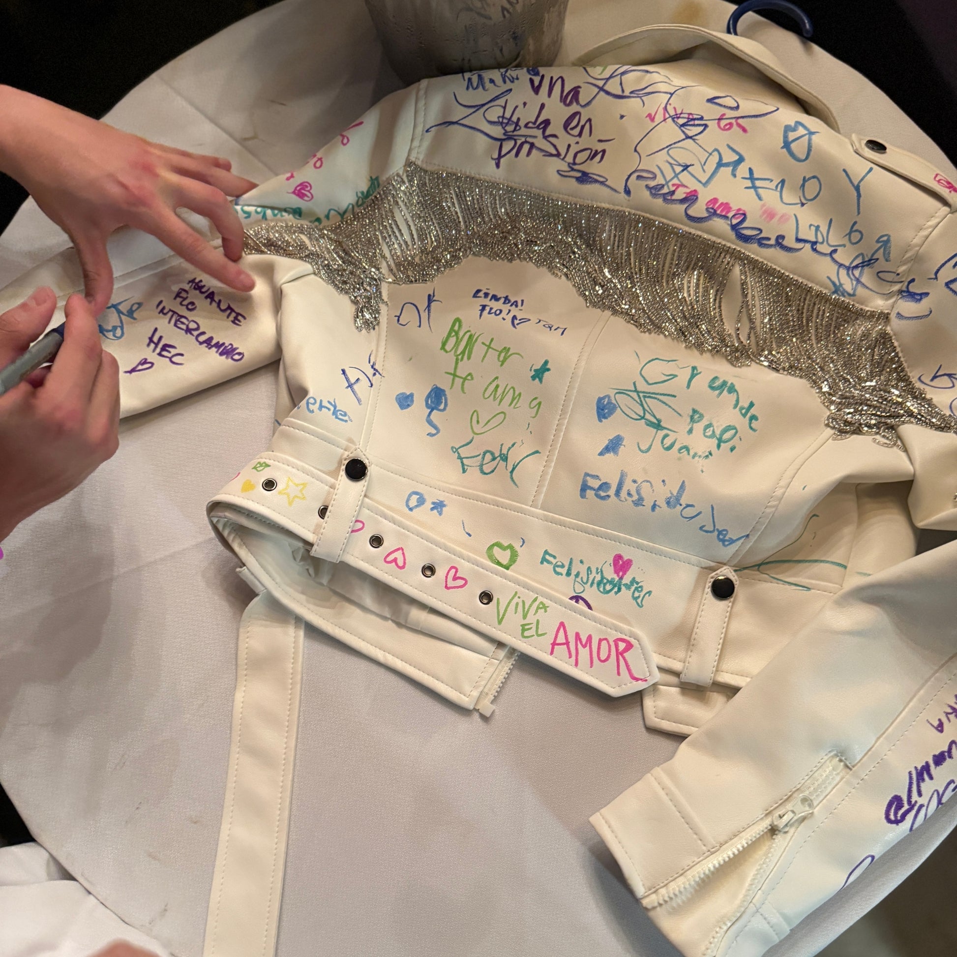 Esta pieza es es la revolución del libro de visitas y el perfecto complemente a la foto de cabina. Usala para la fiesta y deja que tus amigos y familia te escriban sus mejores deseos y recuerdos. Esta opcion incluye una caja blanca de lujo, perfecta para entregar como regalo, marcadores permanentes (3) y un vaso brillantes para que hagas match con tu outfit ya que la chaqueta estará adornada con flecos brillantes en la espalda y media manga